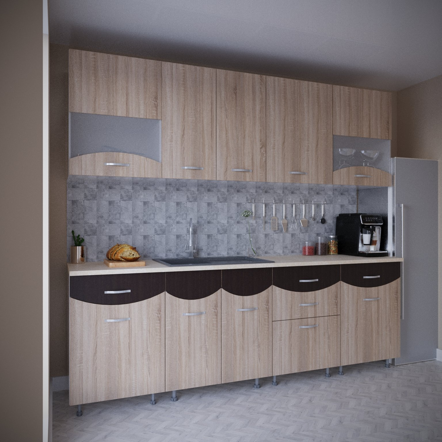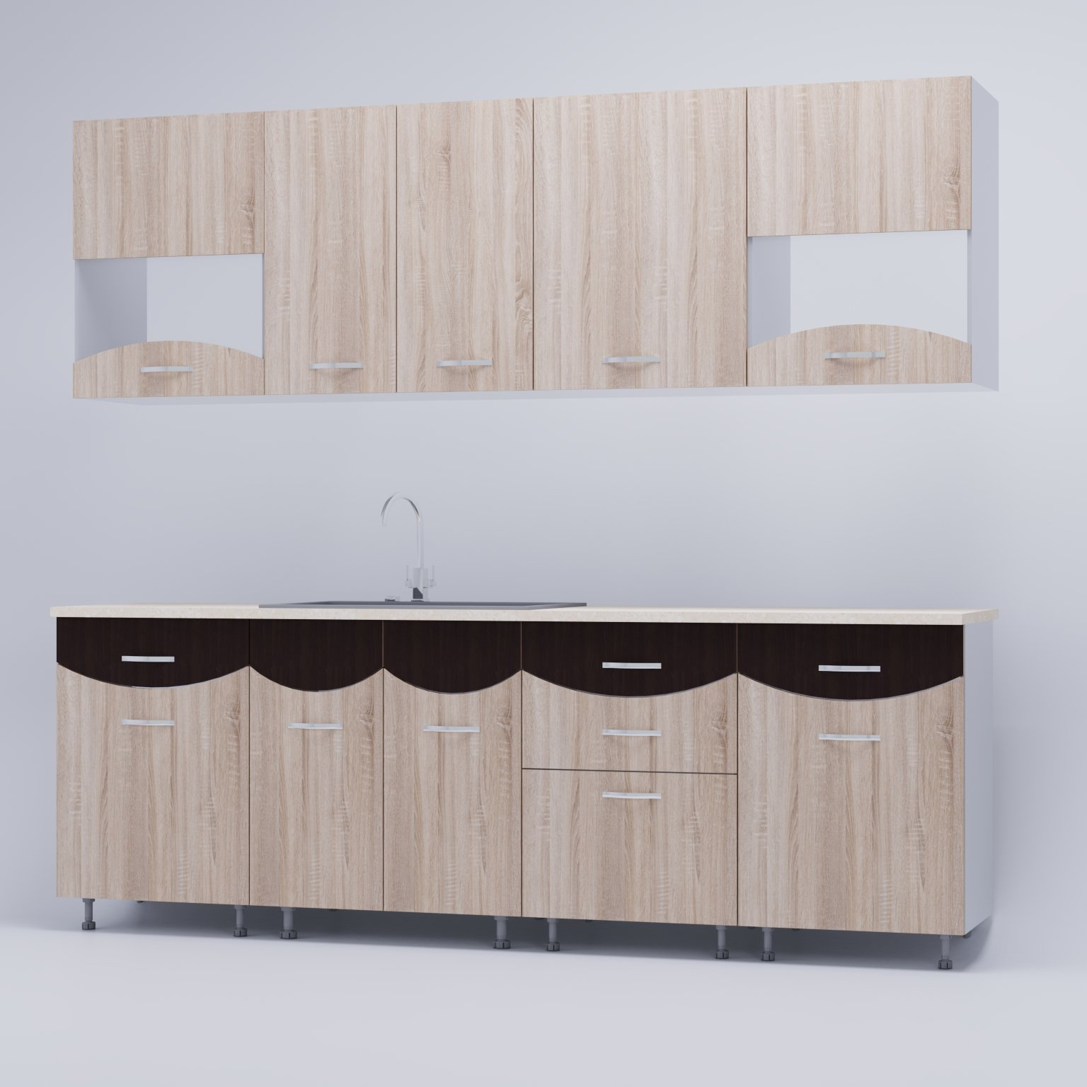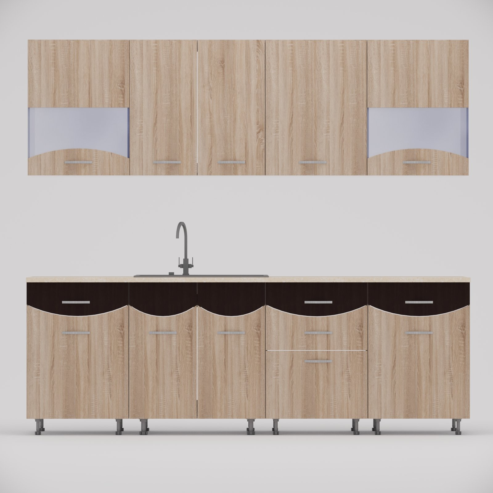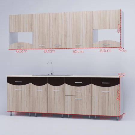Bucatarie Diana,2.6m Wenge/SonomaAmenajarea bucatariei este o decizie destul de grea deoarece petrecem mult timp in aceasta. Daca spatiul tau se rezuma la 260cm si esti un iubitor al culorii Wenge/Sonoma, noi iti recomandam mobila de bucatarie DIANA!!! Notă importantă: Blatul se expediază în funcție de stocul disponibil, în variantă alb sau crem!!! Detalii Materiale:
