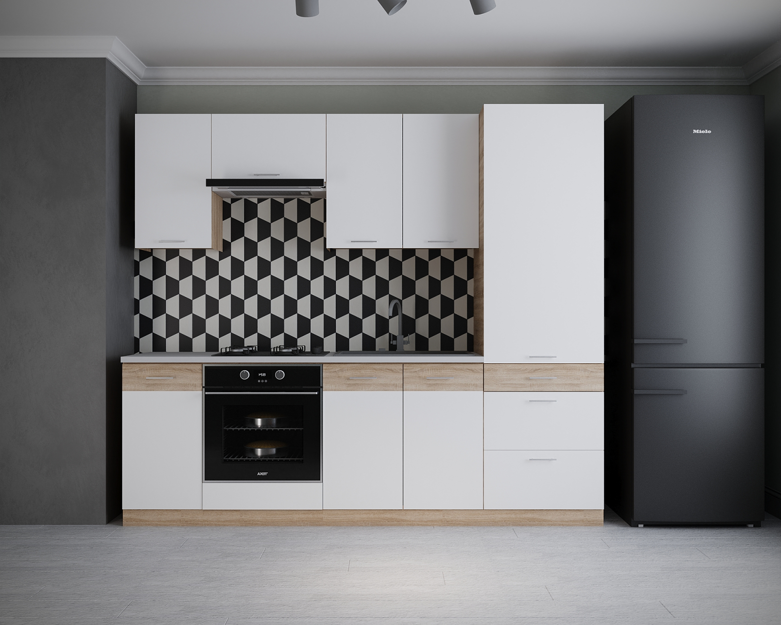 Amenajarea bucatariei este o decizie destul de grea deoarece petrecem mult timp in aceasta.Daca spatiul tau se rezuma la 240cm si esti iubitor al culorii alb&sonoma,noi iti recomandam mobila de bucatarie Nuria!