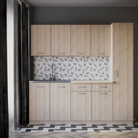 Daca spatiul tau se rezuma la 280cm si esti un iubitor al culorii alb&sonoma, noi iti recomandam mobila de bucatarie Eliza!