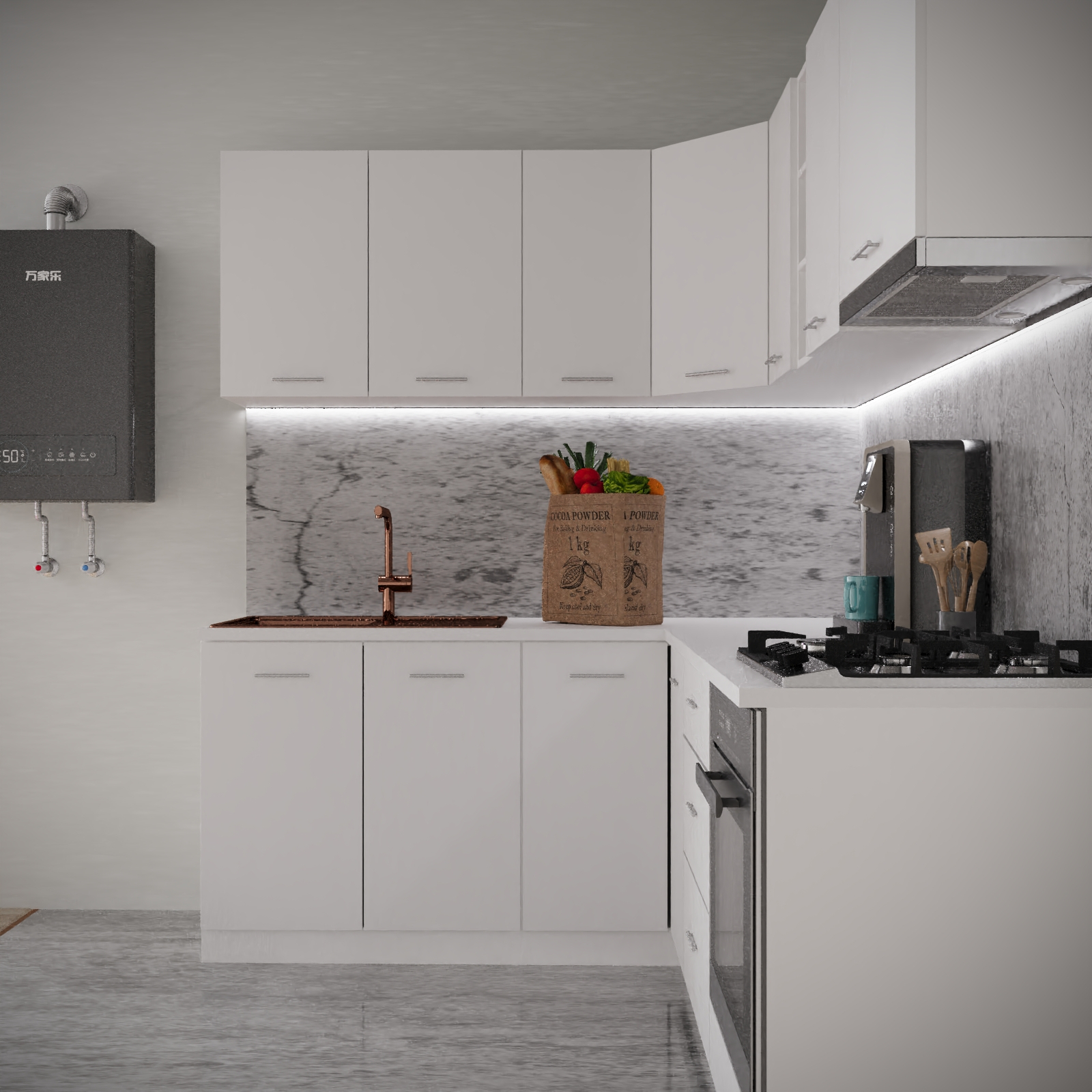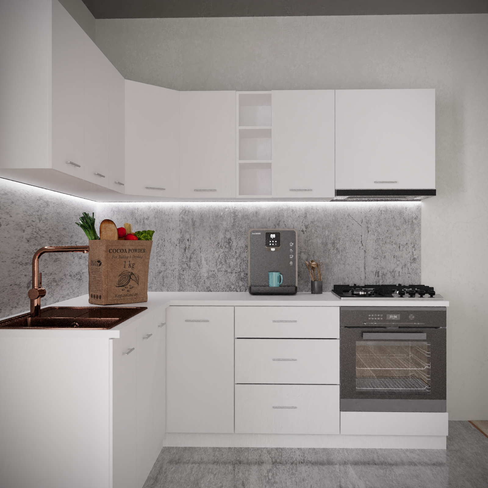 Daca spatiul tau se rezuma la 180 x 220 cm si esti un iubitor al culorii Alb, noi iti recomandam mobila de bucatarie Sena Colt !