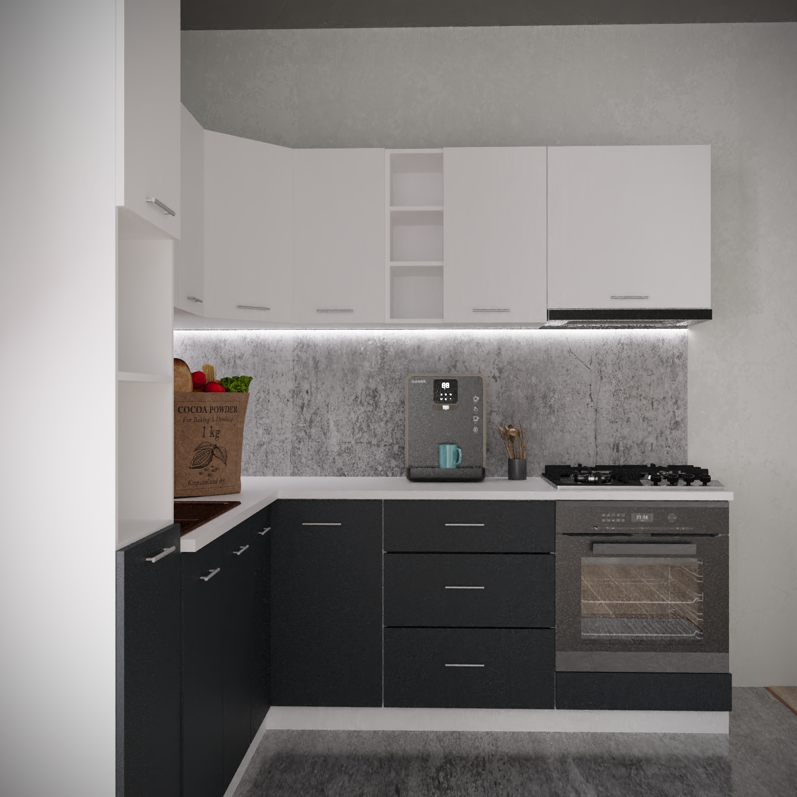 Daca spatiul tau se rezuma la 220 x 220 cm si esti un iubitor al culorii Alb&Antracit, noi iti recomandam mobila de bucatarie Sena Colt !