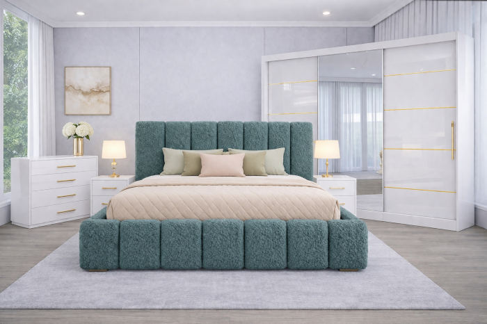 SET DORMITOR DIN MDF LUCIOS CU DULAP DE 250X 200CM , 2NOPTIERE, COMODA SI PAT TAPITAT CU SOMIERA RABATABILA SI LADA DE DEPOZITARE