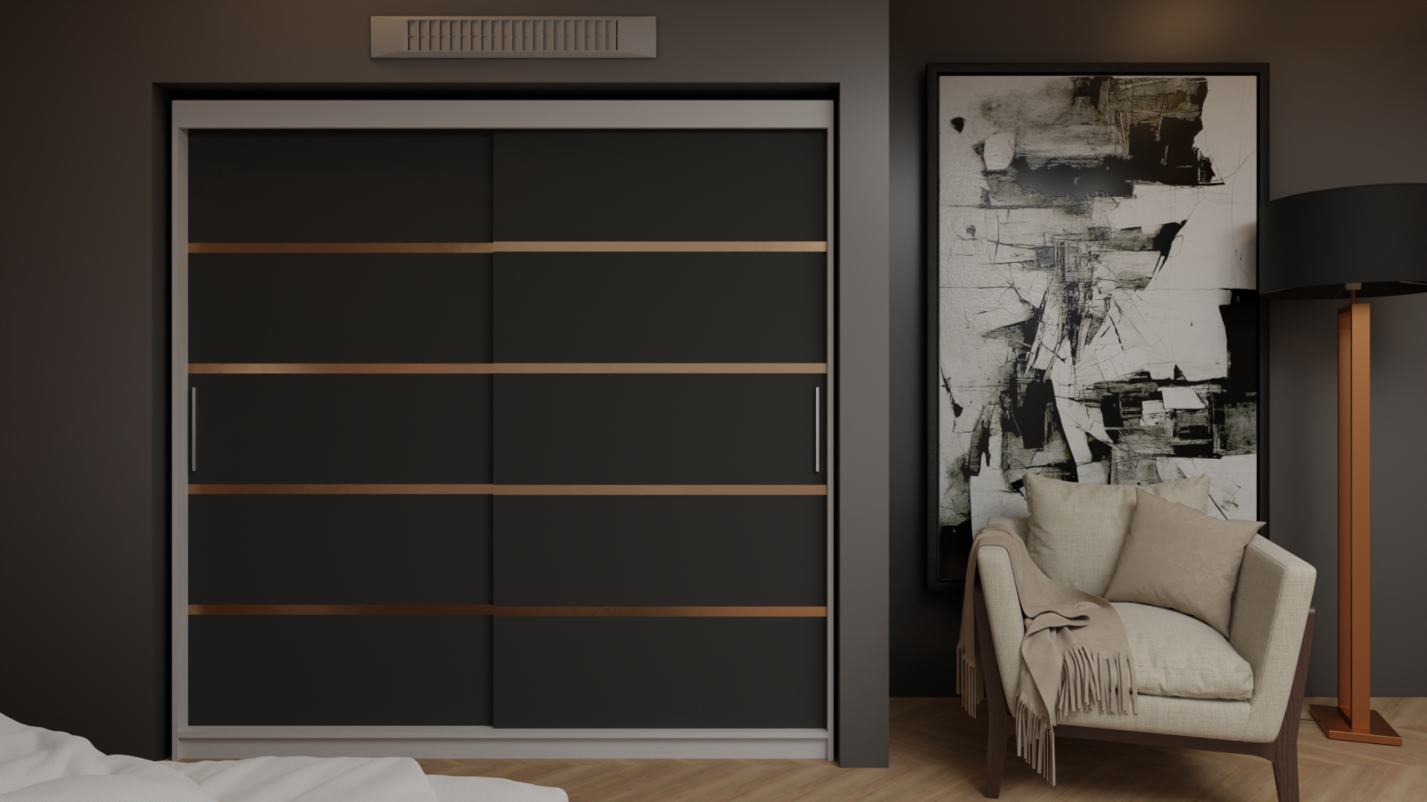 Dormitor Queen cu Pat Tapitat cu dressing 200*200 usi glisante Alb&Gri Antracit, noptiere si comoda