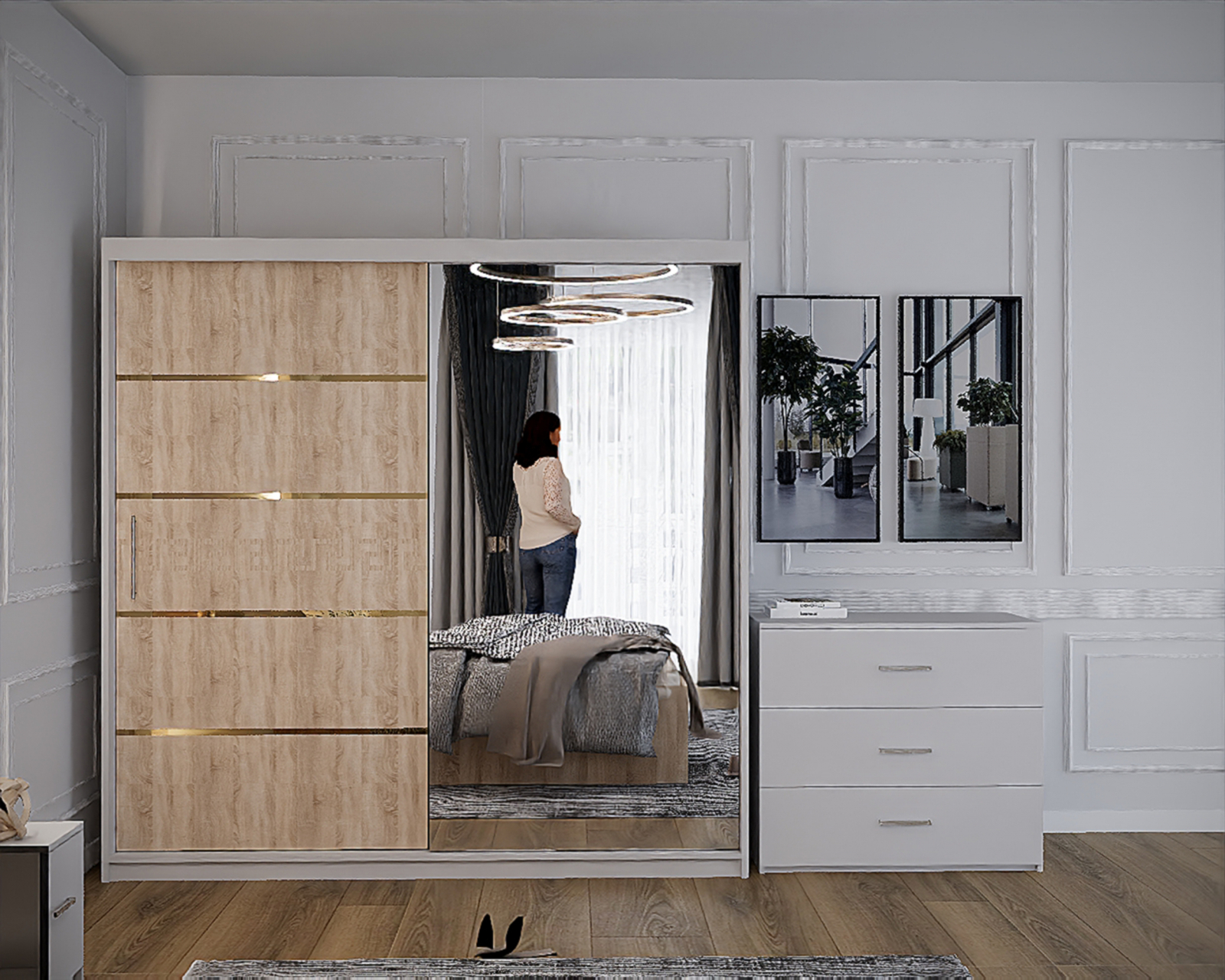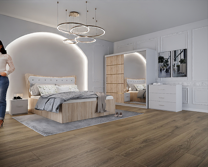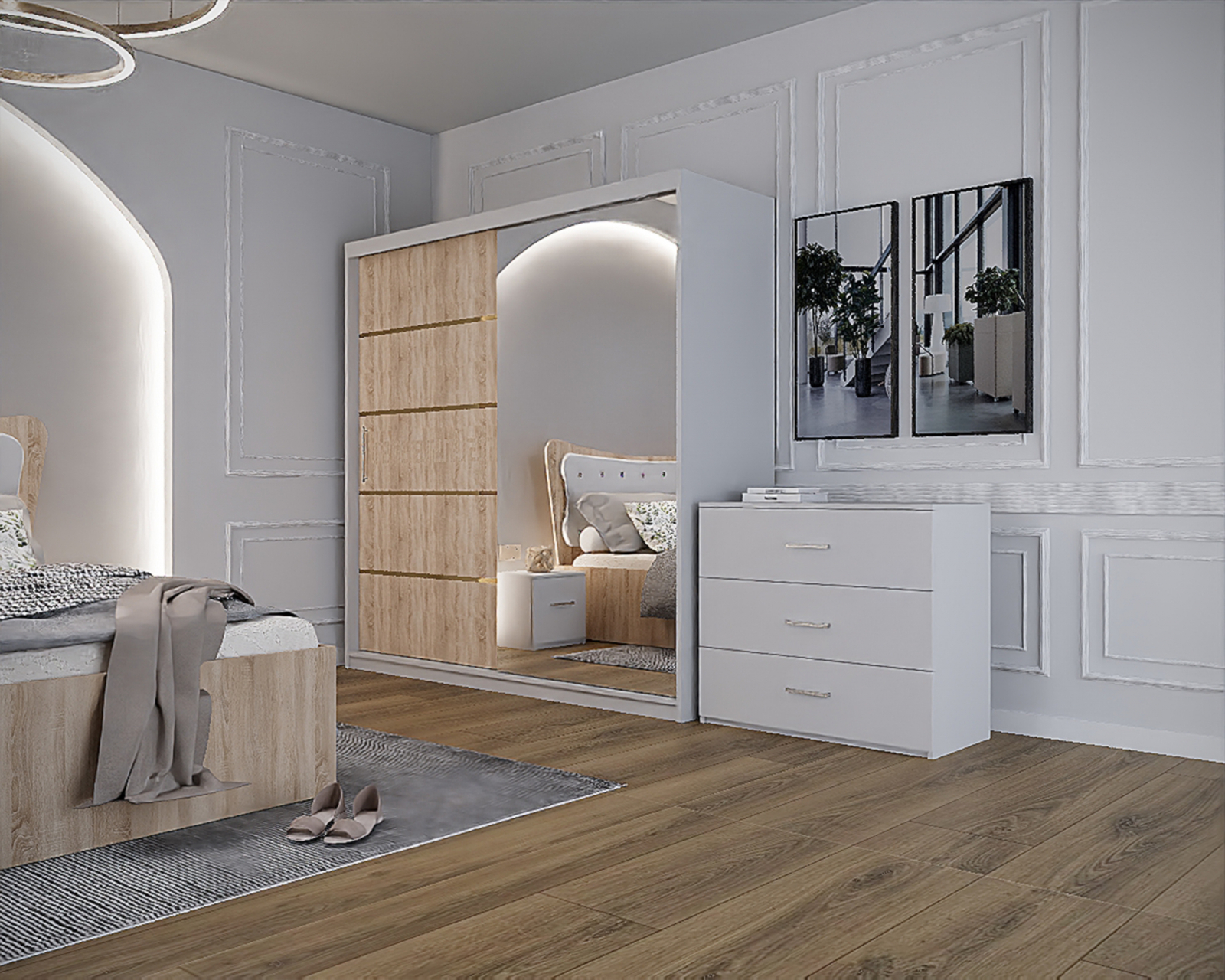 Dormitor Vista cu Pat Tapitat Sonoma&Alb cu dulap 200*200 usi glisante Sonoma&Alb cu Oglinda, noptiere si comoda