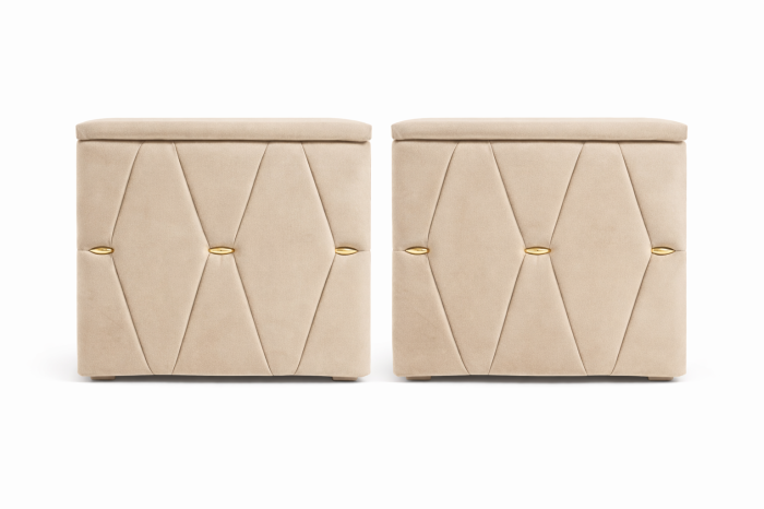 Elegante și rafinate, aceste noptiere tapițate cu stofă de înaltă calitate adaugă un plus de stil oricărui dormitor. Modelul geometric decorativ și accentele metalice aurii oferă un aspect sofisticat, iar structura solidă garantează durabilitate în timp.