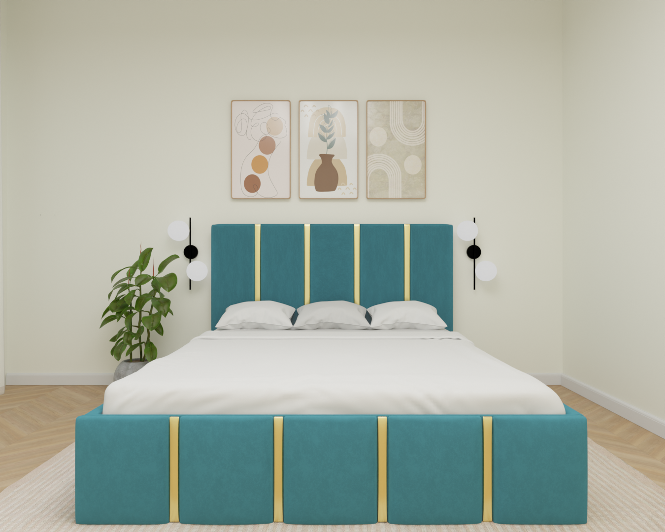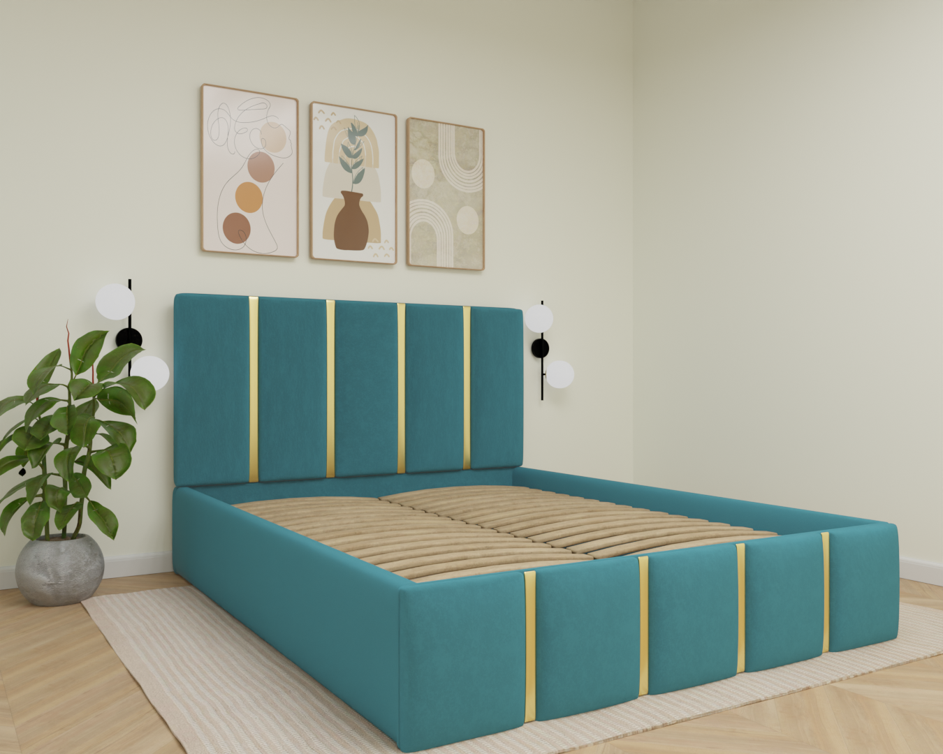 Un pat modern, tapițat în stofă elegantă, cu tăblie înaltă și detalii verticale decorative. Oferă confort, stabilitate și un design rafinat, perfect pentru a crea un dormitor cald și stilat.