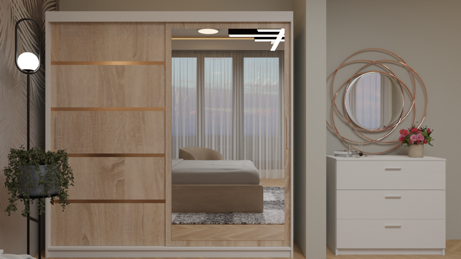 Dormitor Cairo cu Pat Tapitat cu Dressing 200*200 usi glisante Alb&Sonoma cu oglinda , noptiere si comoda