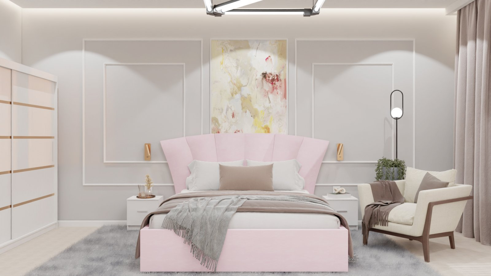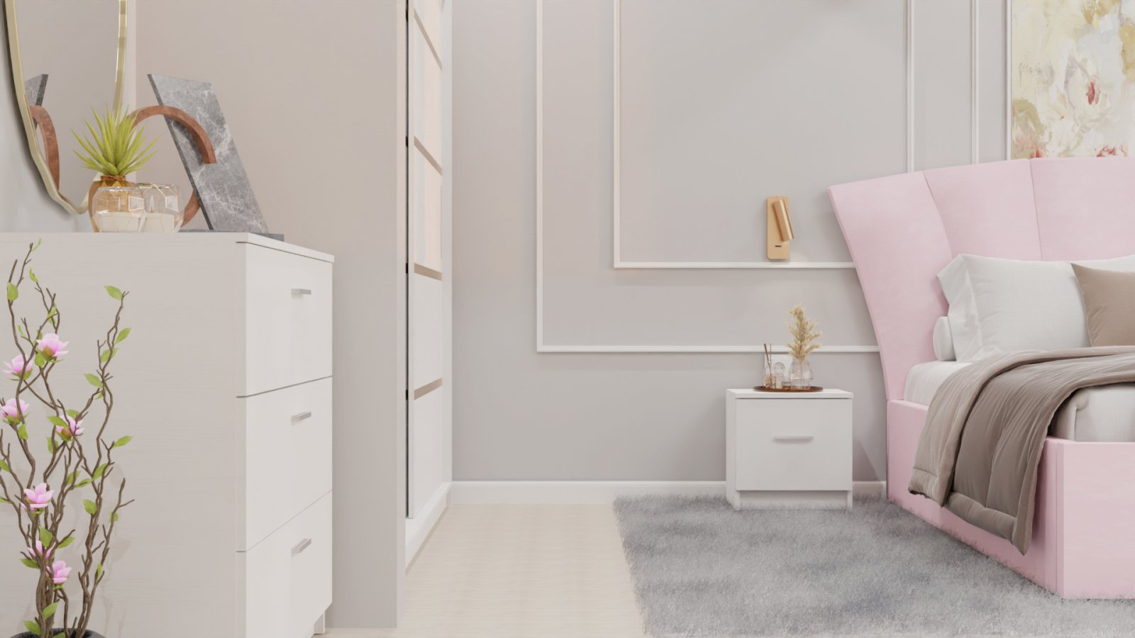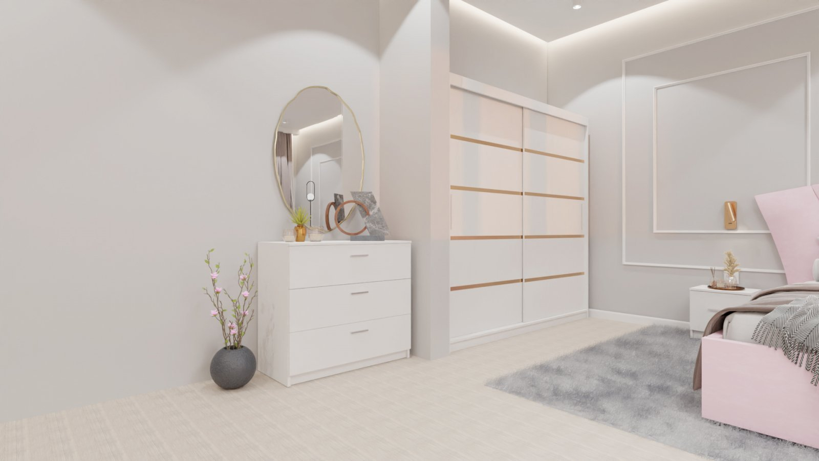 Dormitor Lucas cu Pat Tapitat Stofa Roz cu dulap 200*200 usi glisante Alb , noptiere si comoda