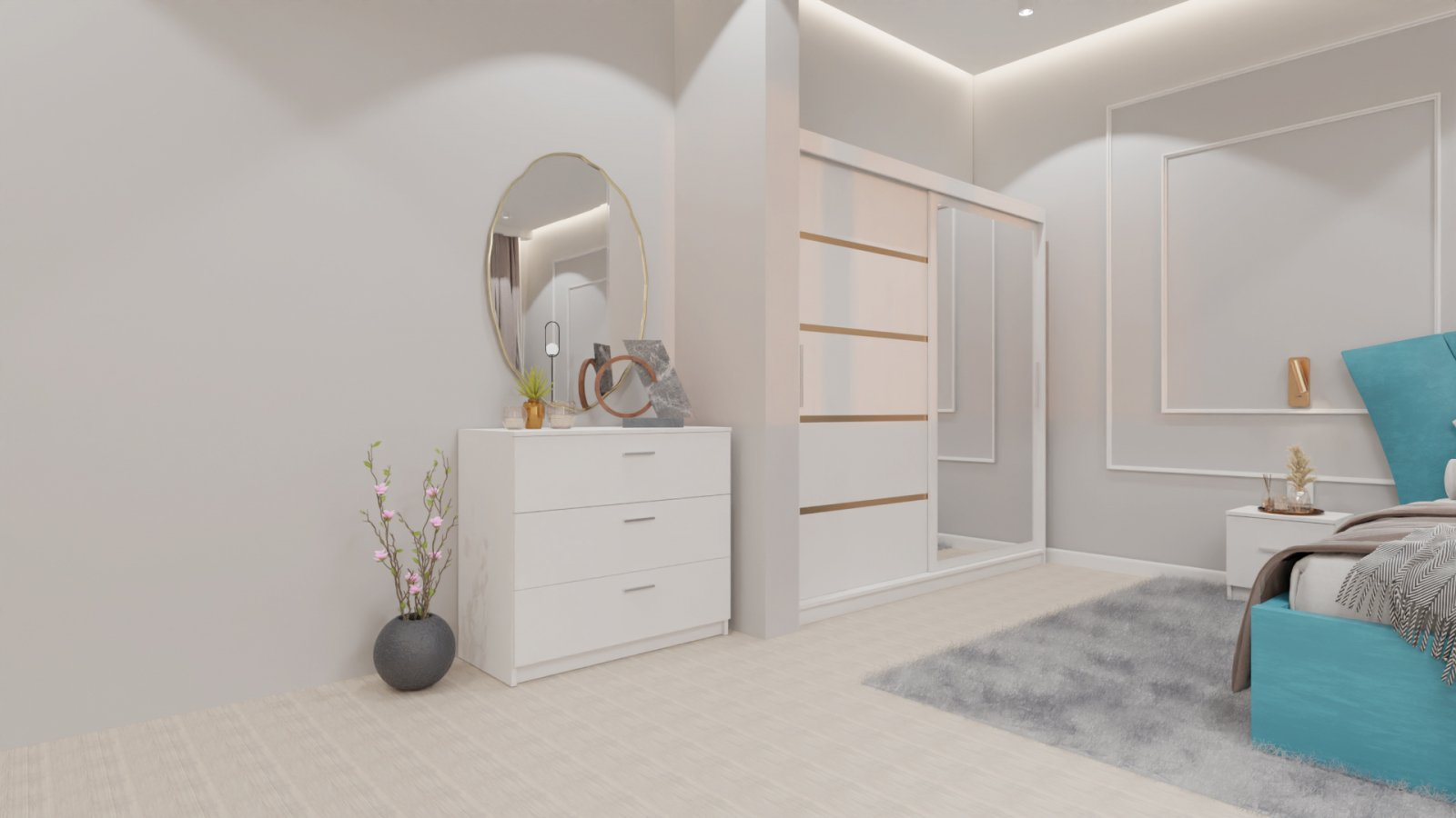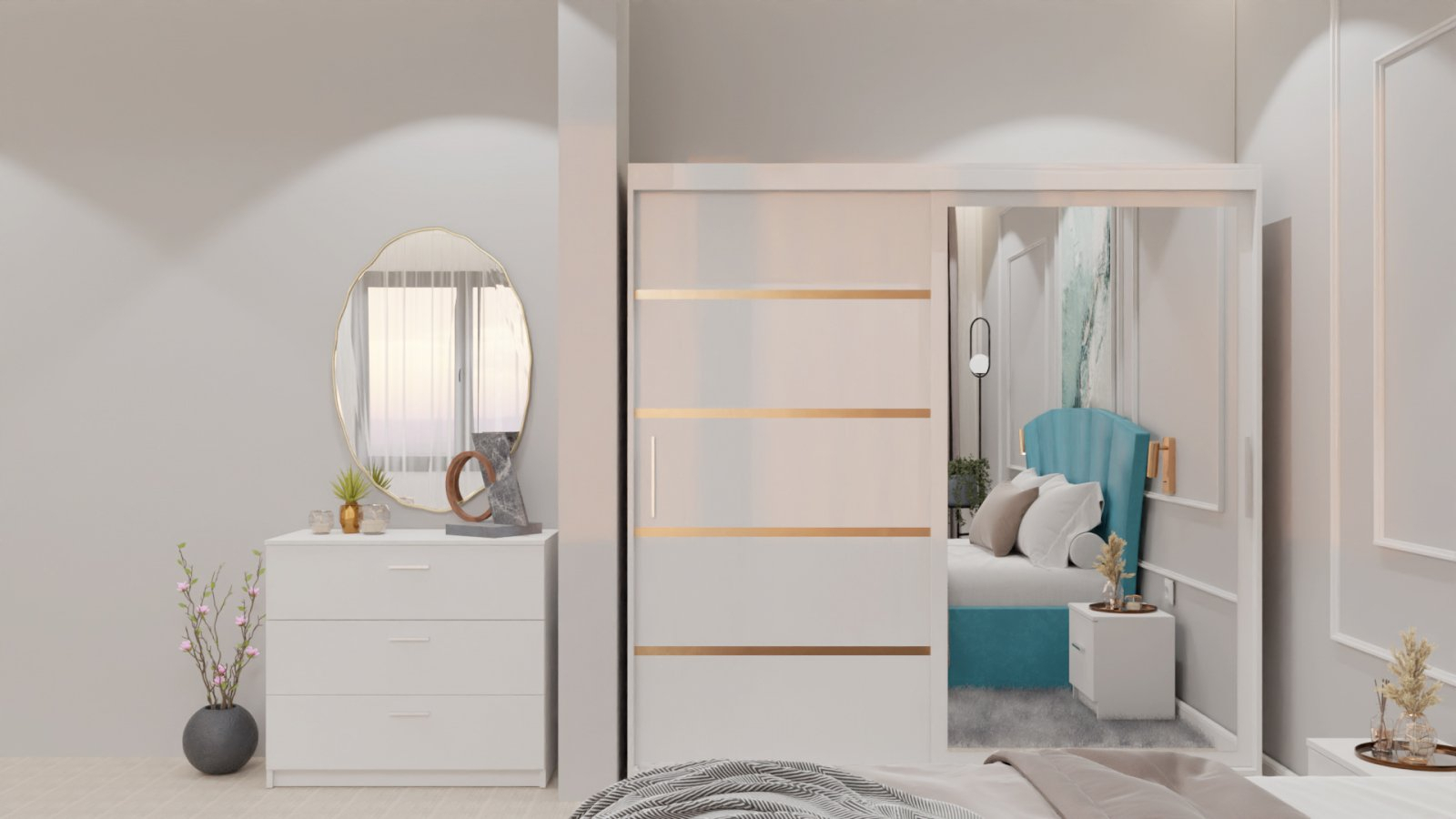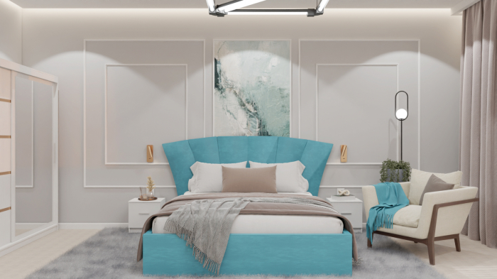 Dormitor Lucas cu Pat Tapitat Stofa Turcoaz cu dulap 200*200 usi glisante Alb cu oglinda , noptiere si comoda