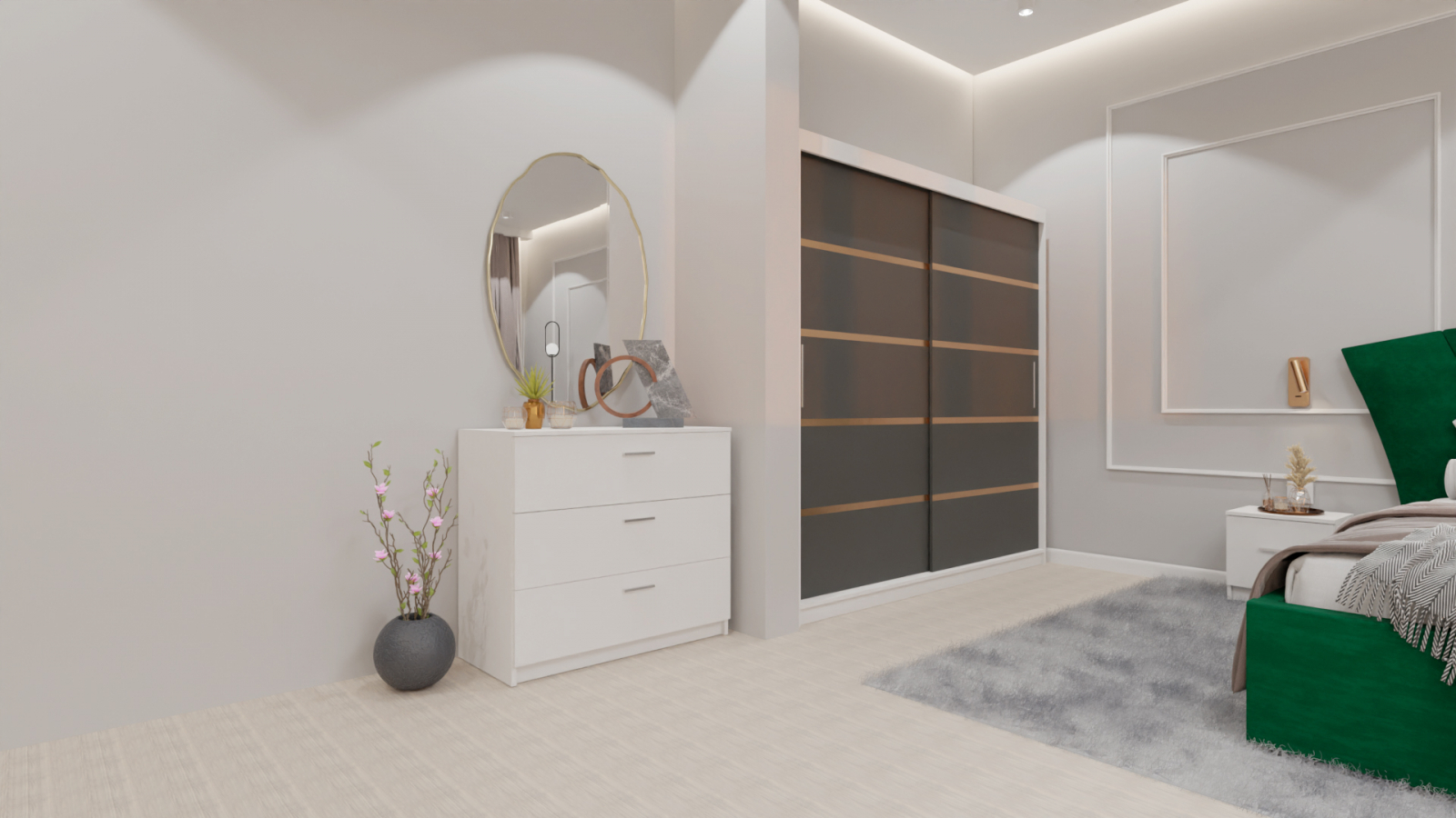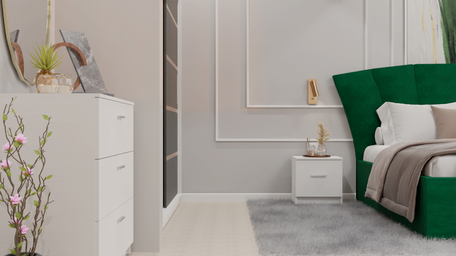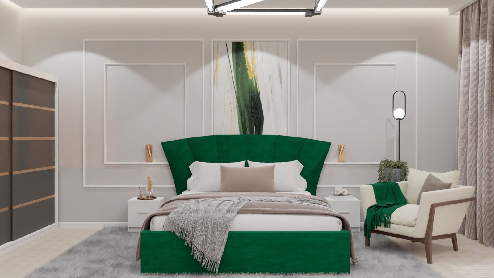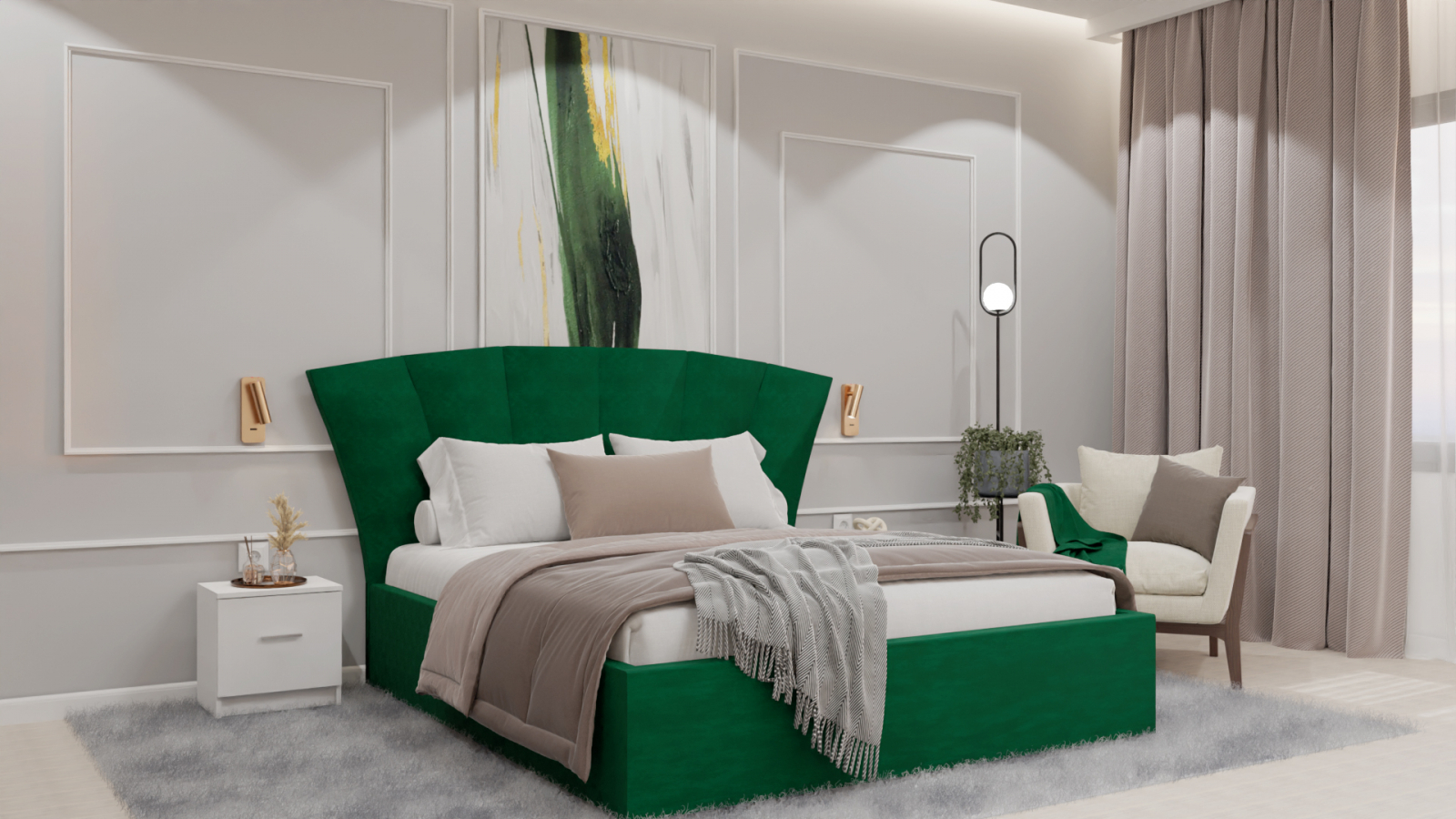 Dormitor Lucas cu Pat Tapitat Stofa Verde cu dulap 200*200 usi glisante Antracit&Alb , noptiere si comoda