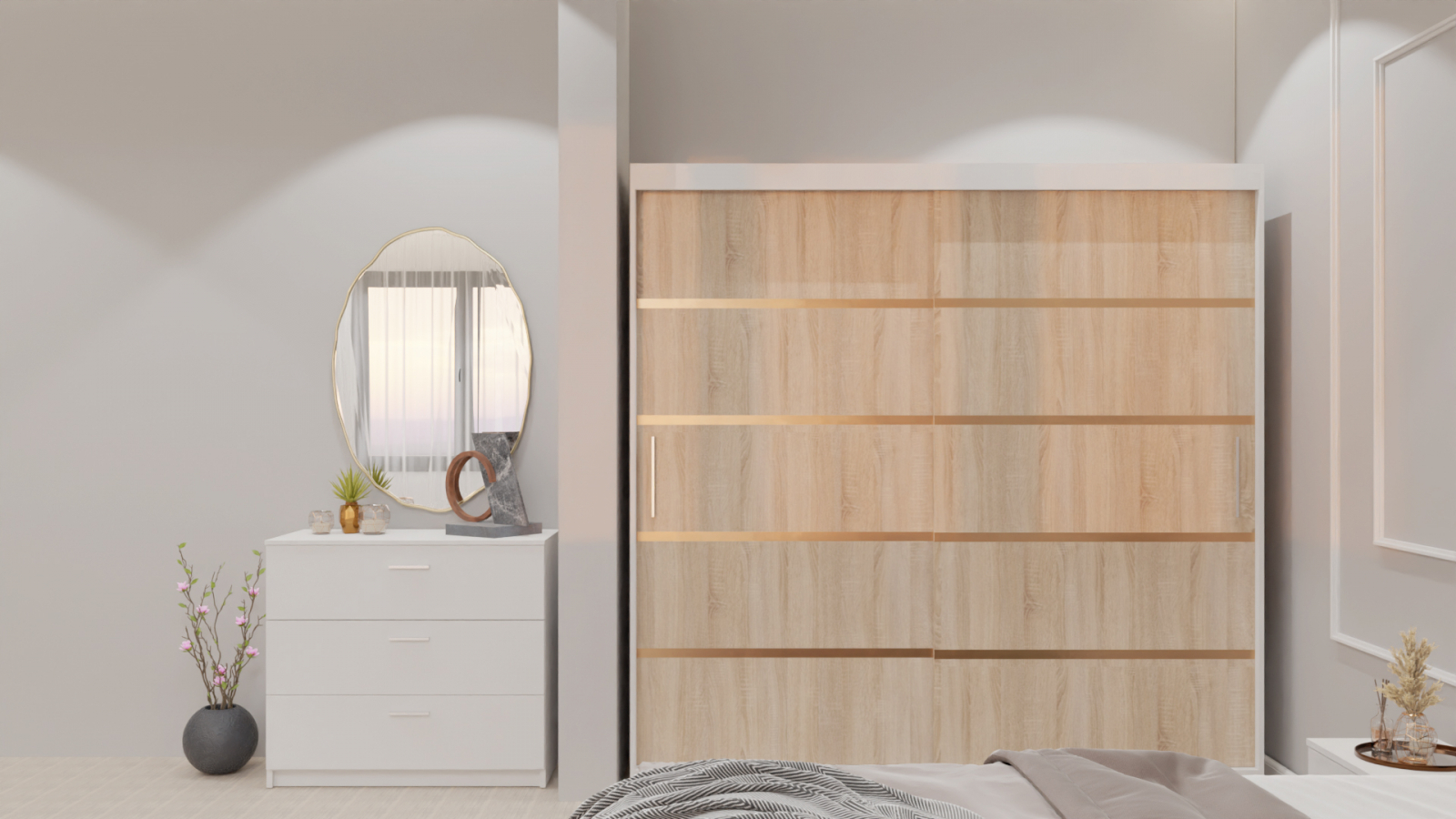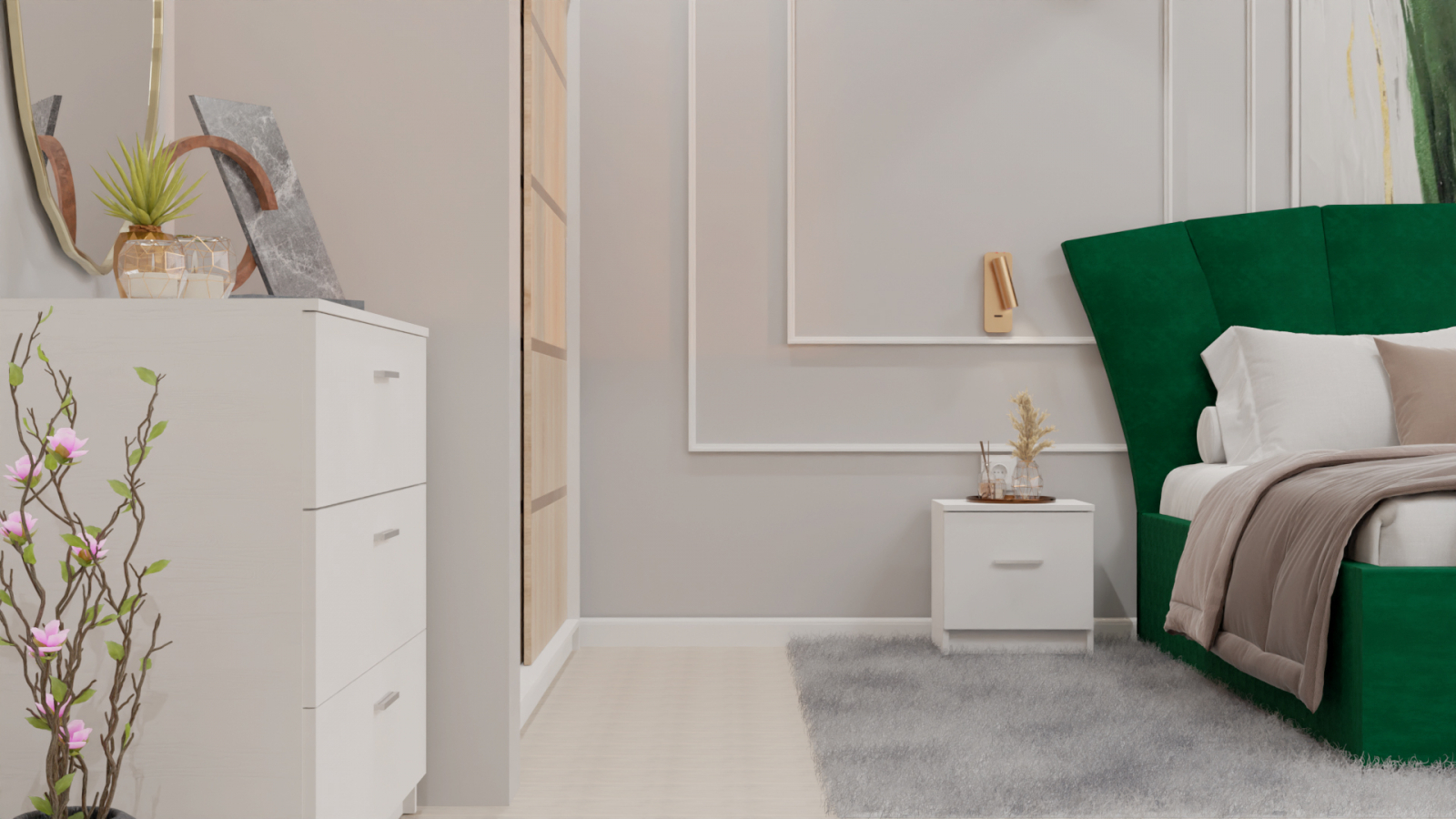 Dormitor Lucas cu Pat Tapitat Stofa Verde cu dulap 200*200 usi glisante Sonoma&Alb , noptiere si comoda
