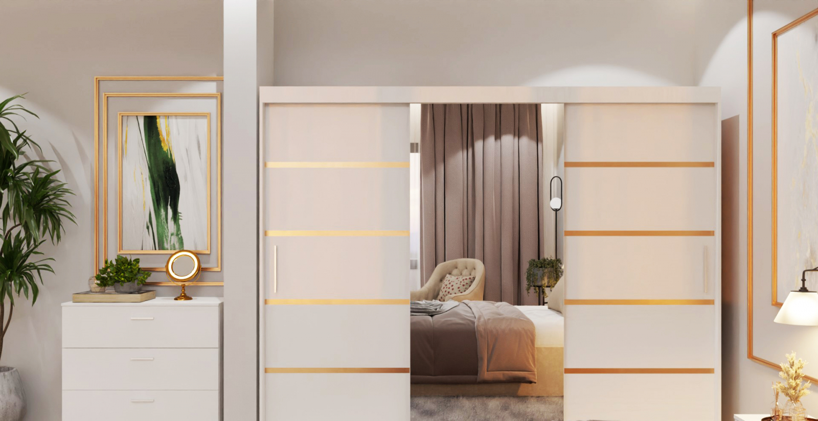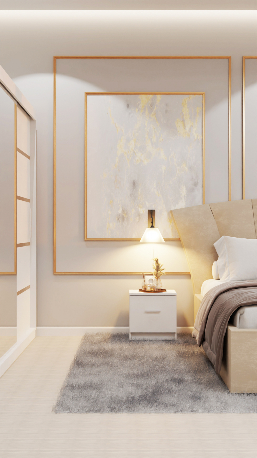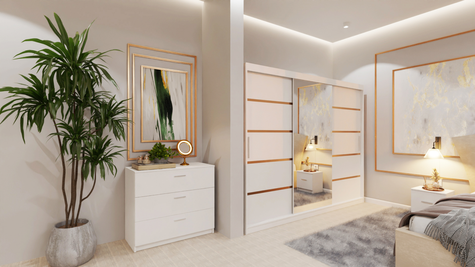 Dormitor Lucas Tapitat Stofa Bej cu dulap 250*200 usi glisante Alb cu Oglinda, noptiere si comoda