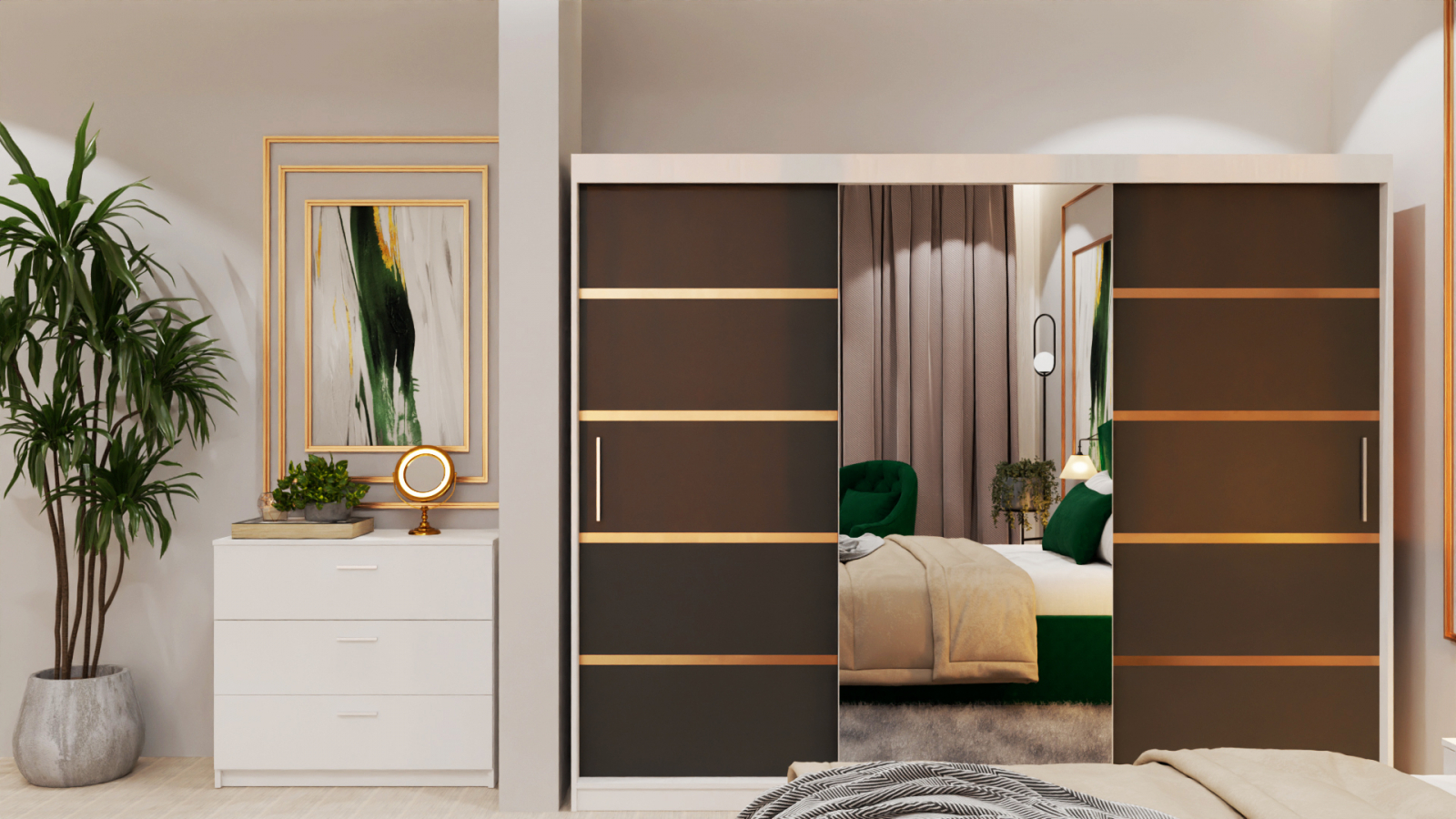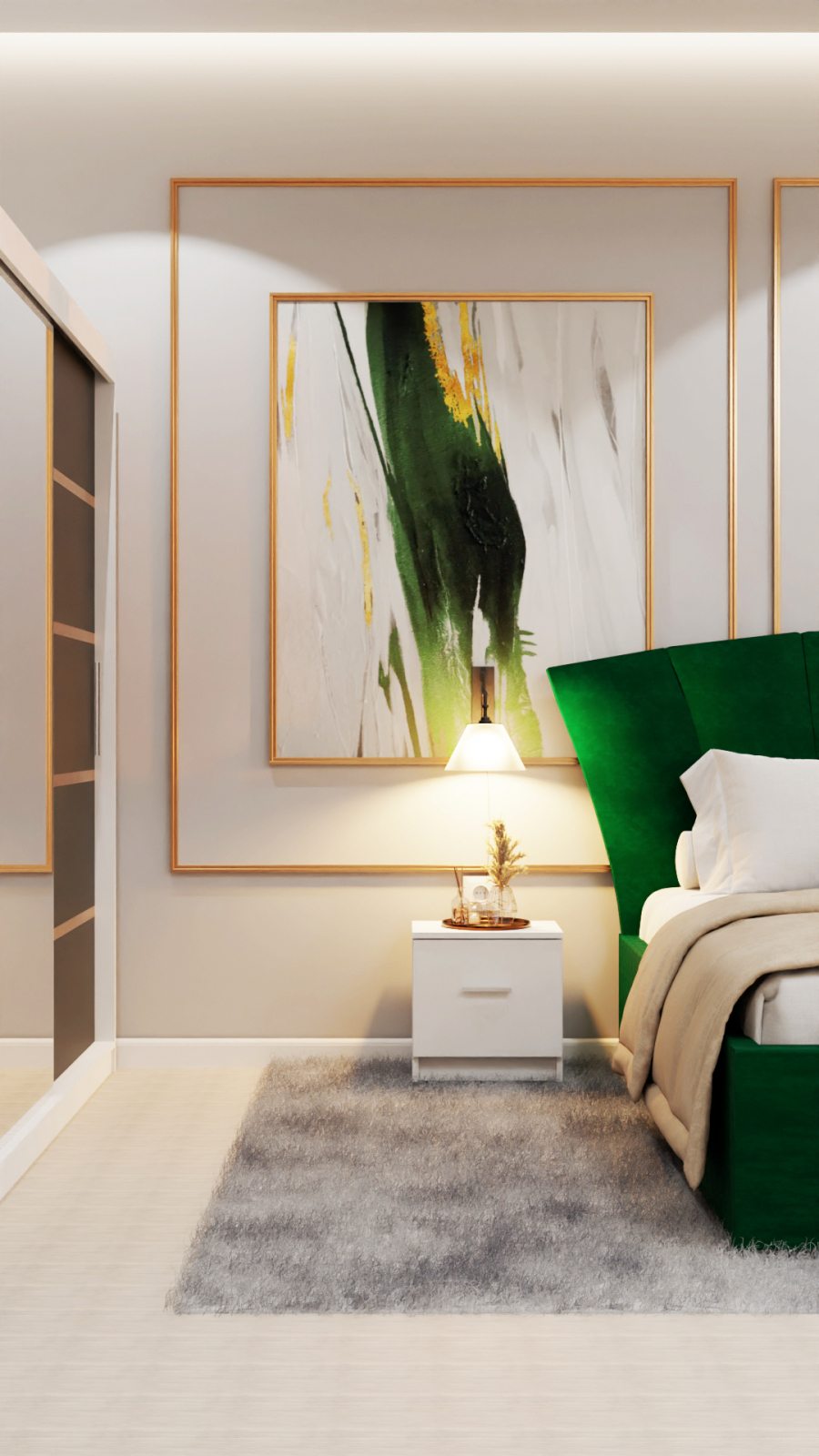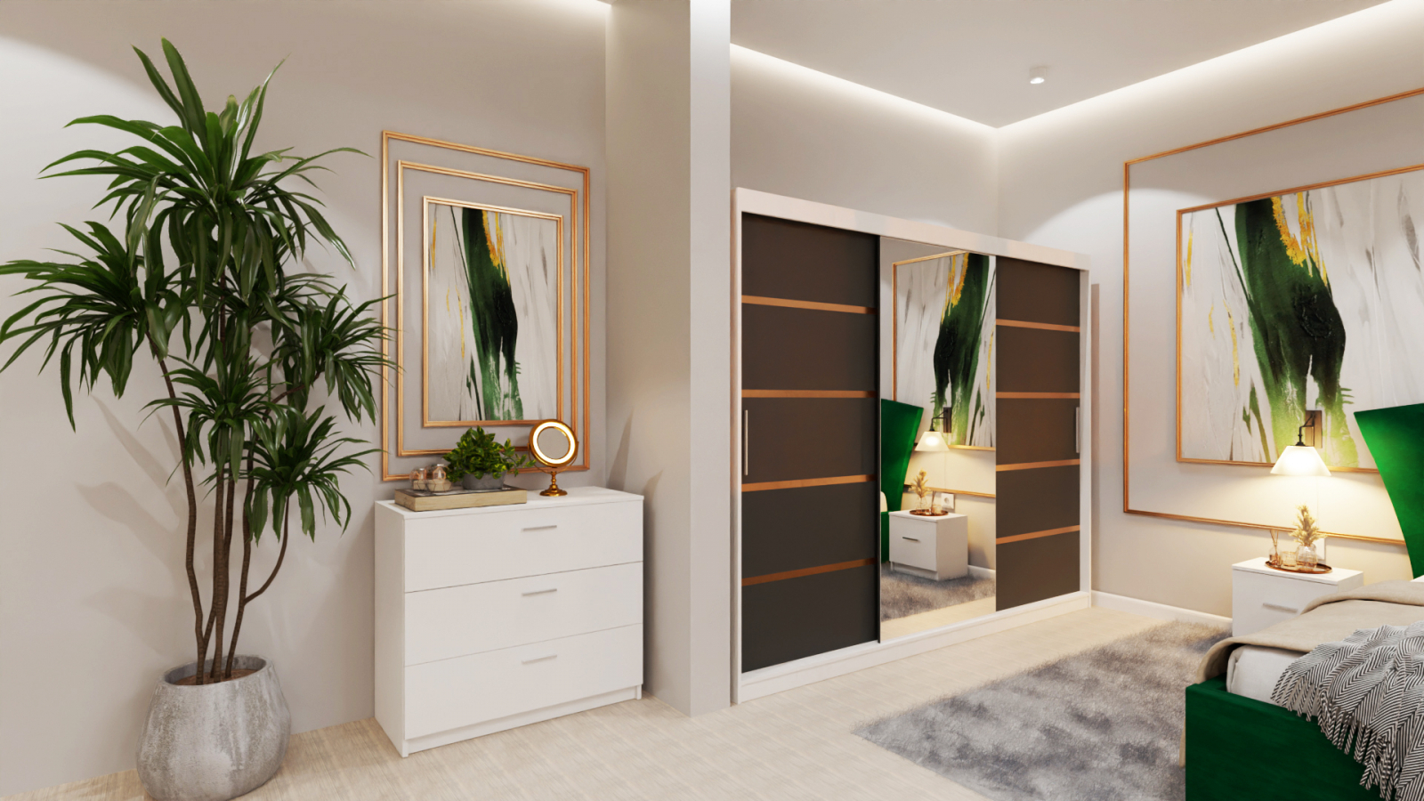 Dormitor Lucas Tapitat Stofa Verde cu dulap 250*200 usi glisante Alb&Antracit cu Oglinda, noptiere si comoda