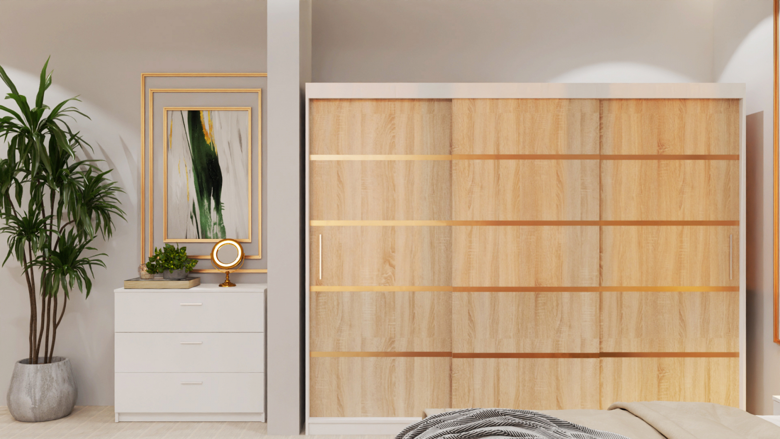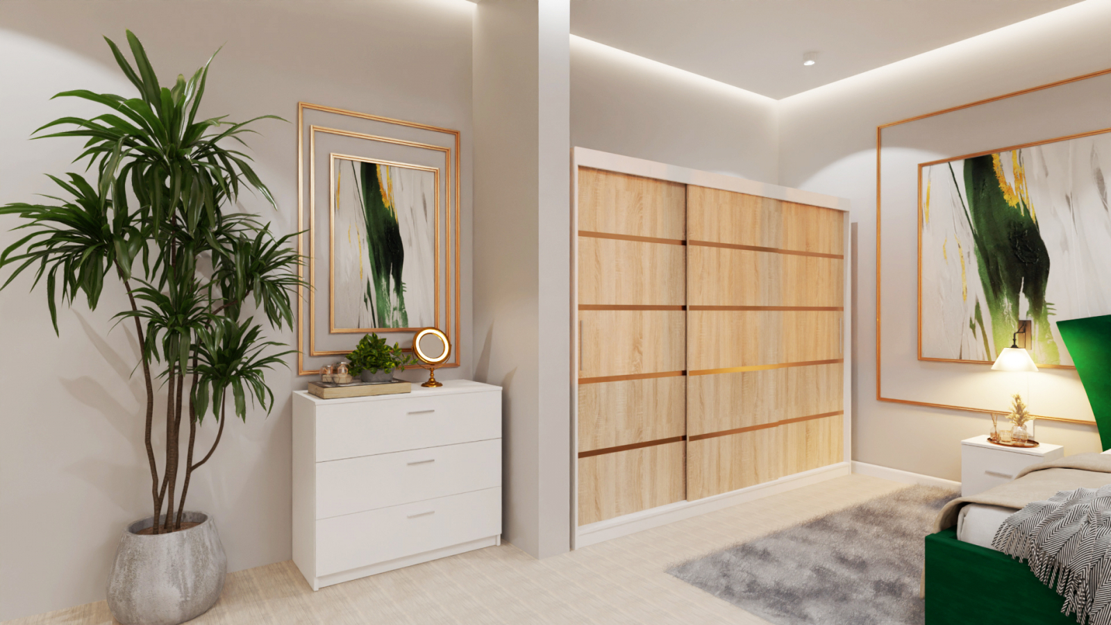 Dormitor Lucas Tapitat Stofa Verde cu dulap 250*200 usi glisante Alb&Sonoma, noptiere si comoda
