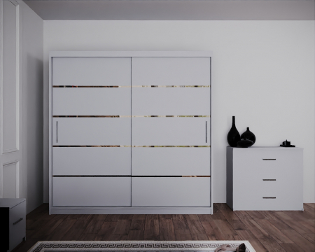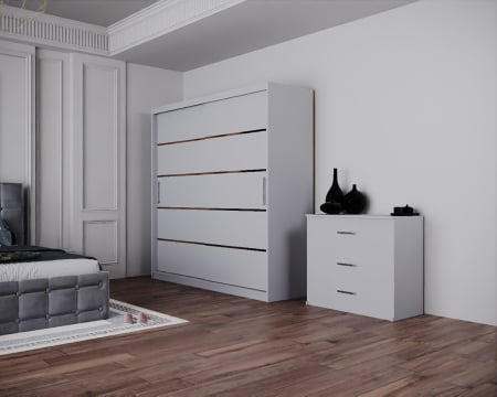 Dormitor Regal cu Pat Tapitat Stofa Gri cu dulap 200*200 usi glisante Alb, noptiere si comoda