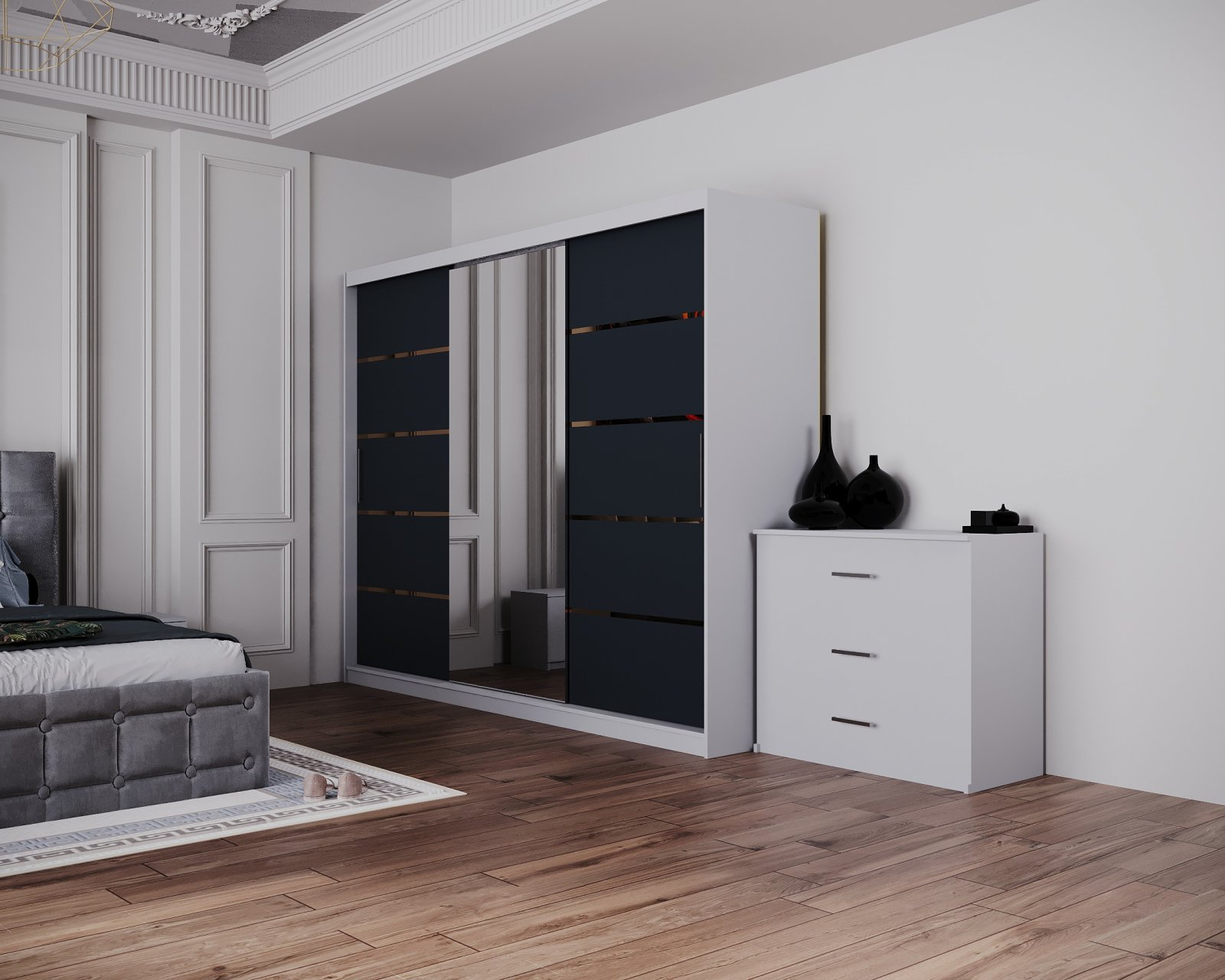 Dormitor Regal cu Pat Tapitat Stofa Gri cu dulap 250*200 usi glisante Alb&Antracit cu Oglinda, noptiere si comoda