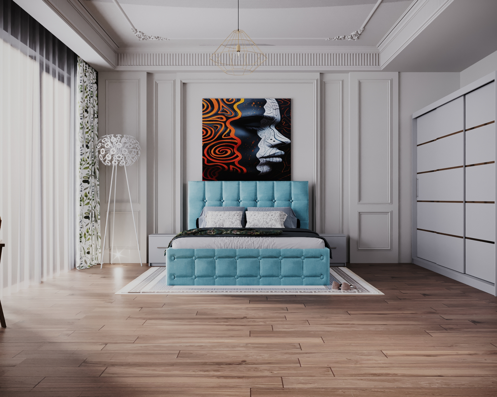 Dormitor Regal cu Pat Tapitat Stofa Turquaz cu dulap 250*200 usi glisante Alb, noptiere si comoda