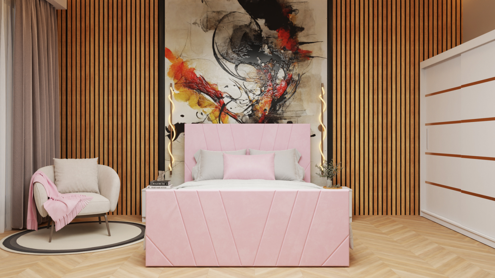 Dormitor Tony Tapitat 160x 200 Stofa Roz cu dulap 200*200 usi glisante Alb, noptiere si comoda