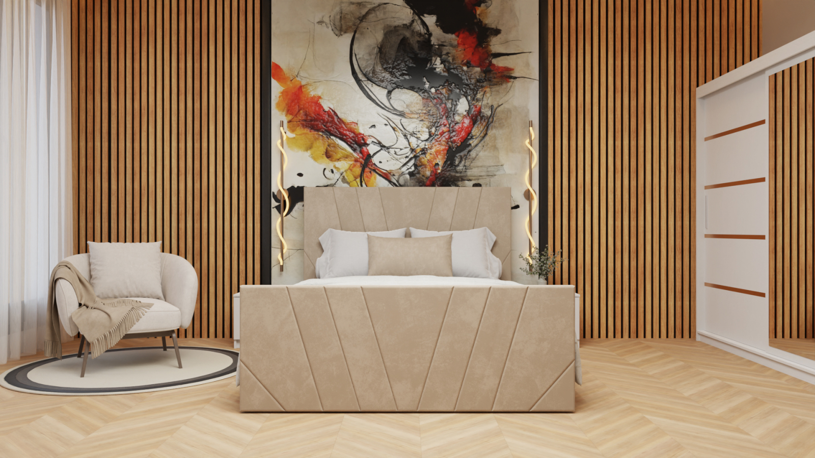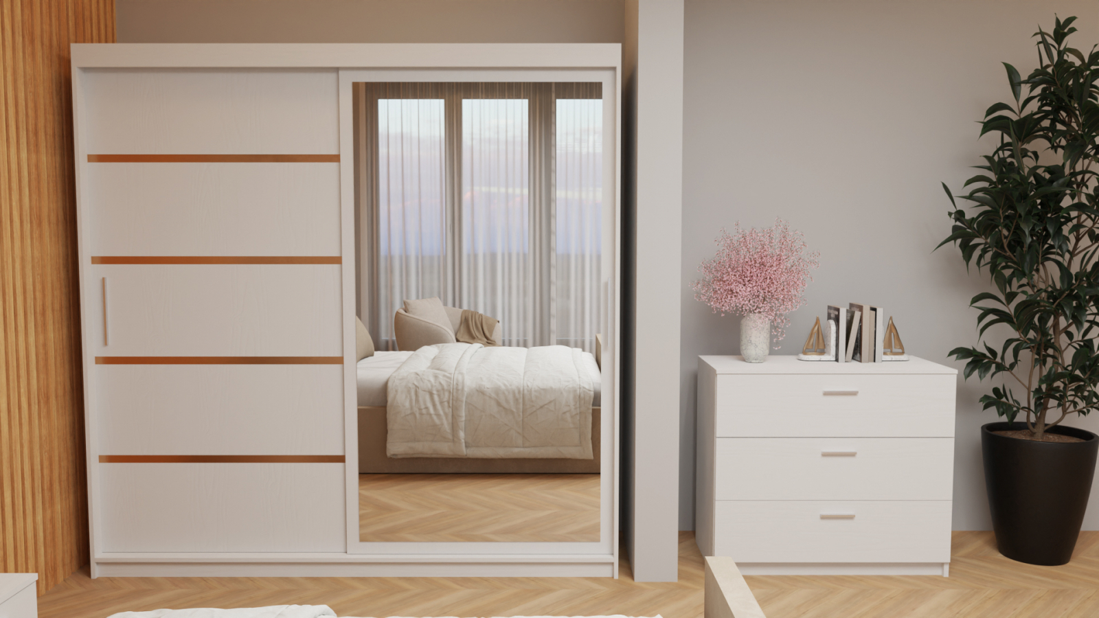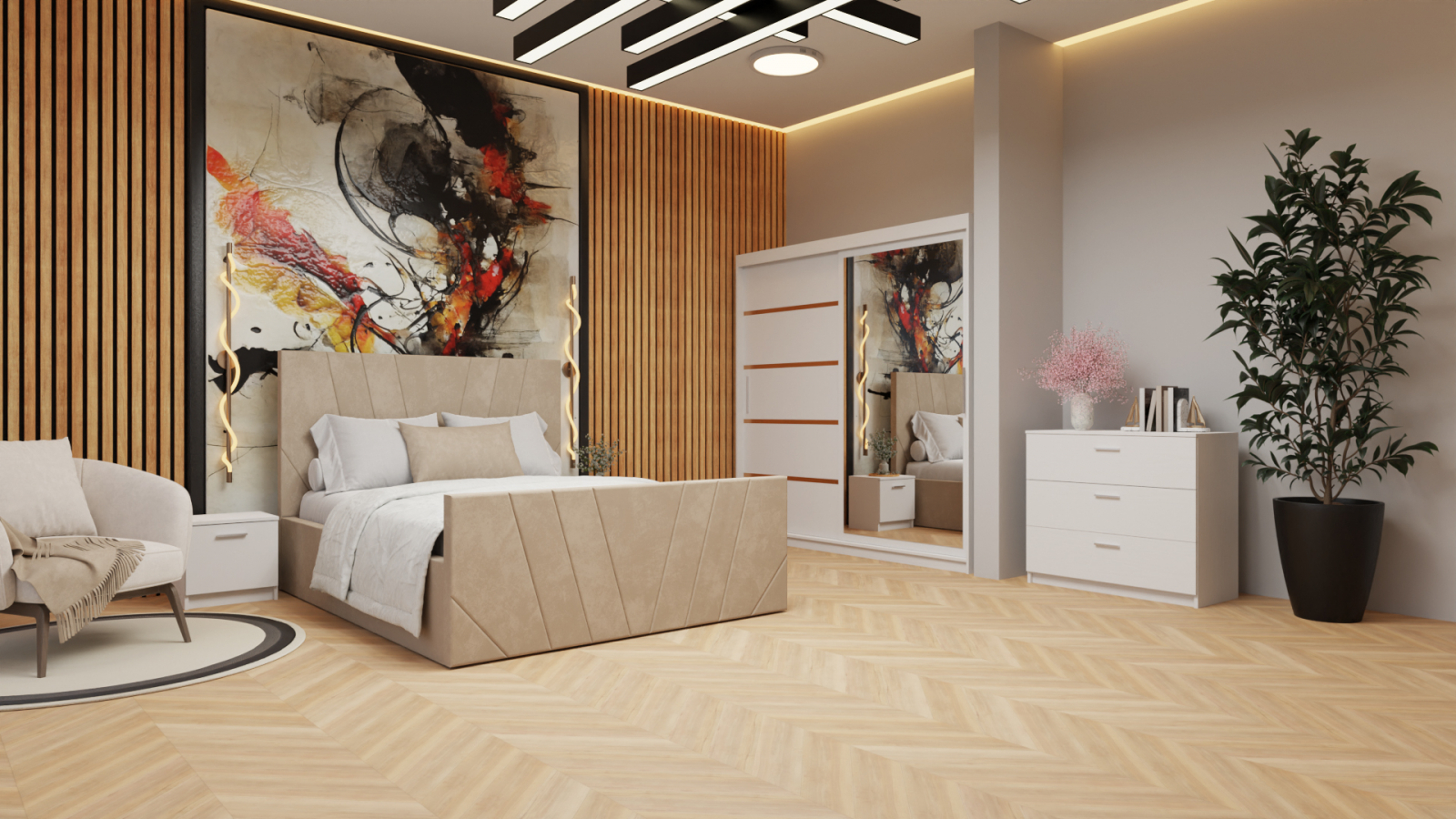 Dormitor Tony Tapitat Stofa Bej cu dulap 200*200 usi glisante Alb cu Oglinda, noptiere si comoda