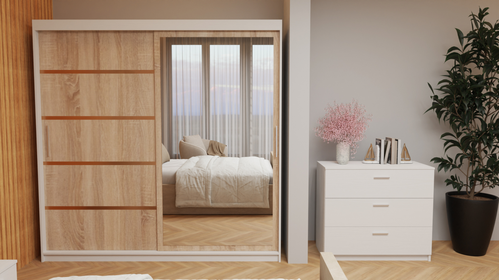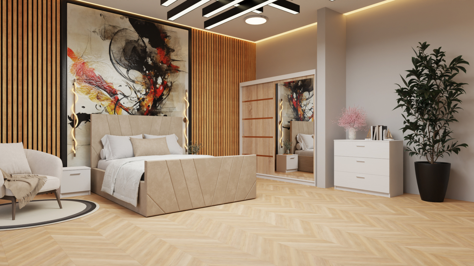 Dormitor Tony Tapitat Stofa Bej cu dulap 200*200 usi glisante Sonoma&Alb, Cu Oglinda, noptiere si comoda