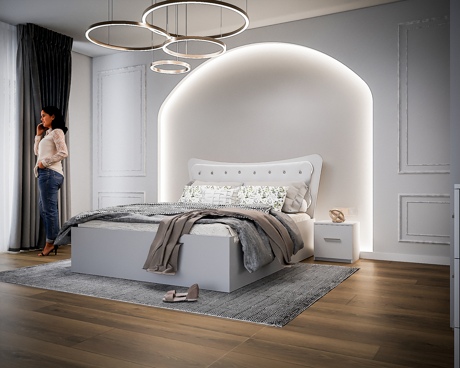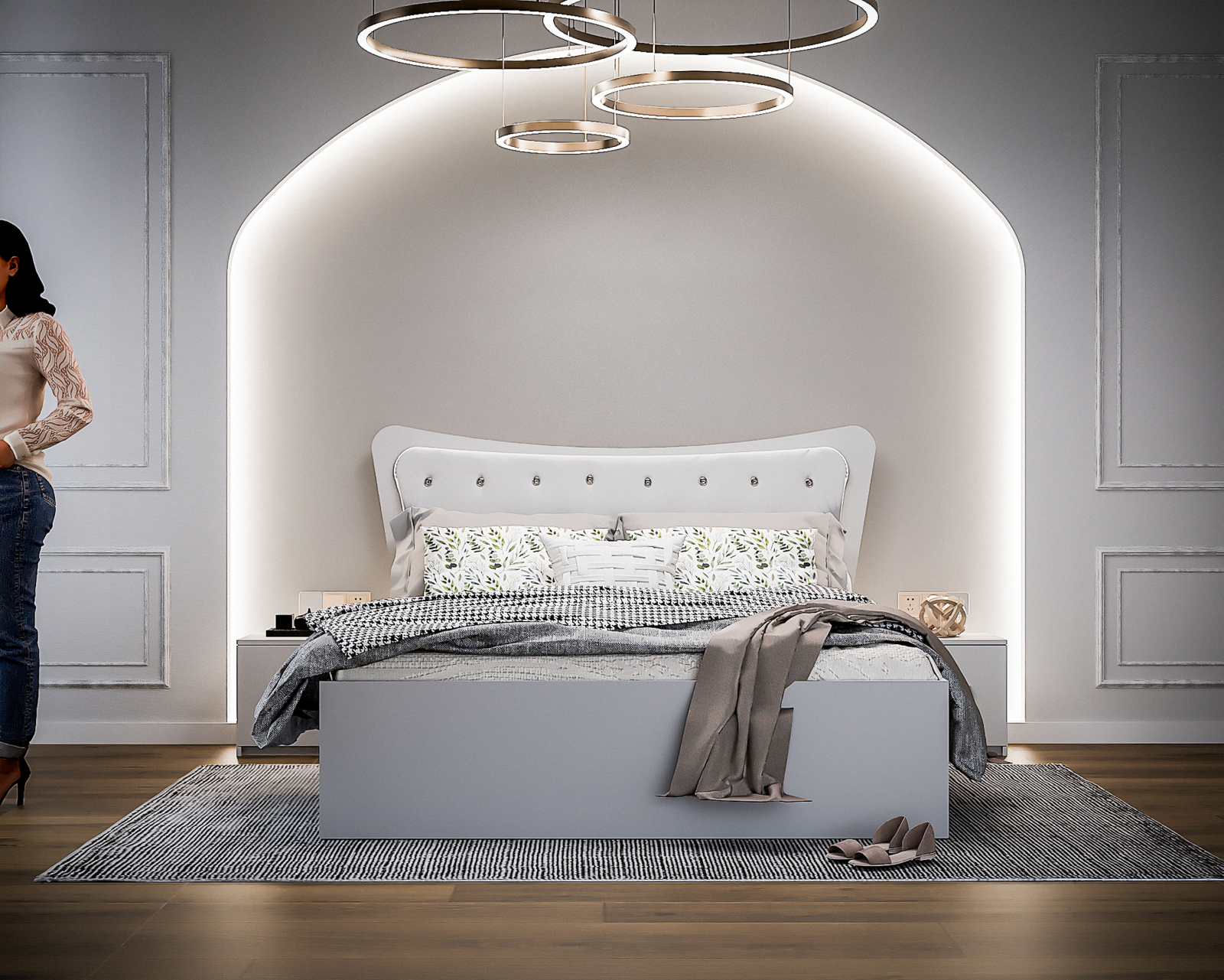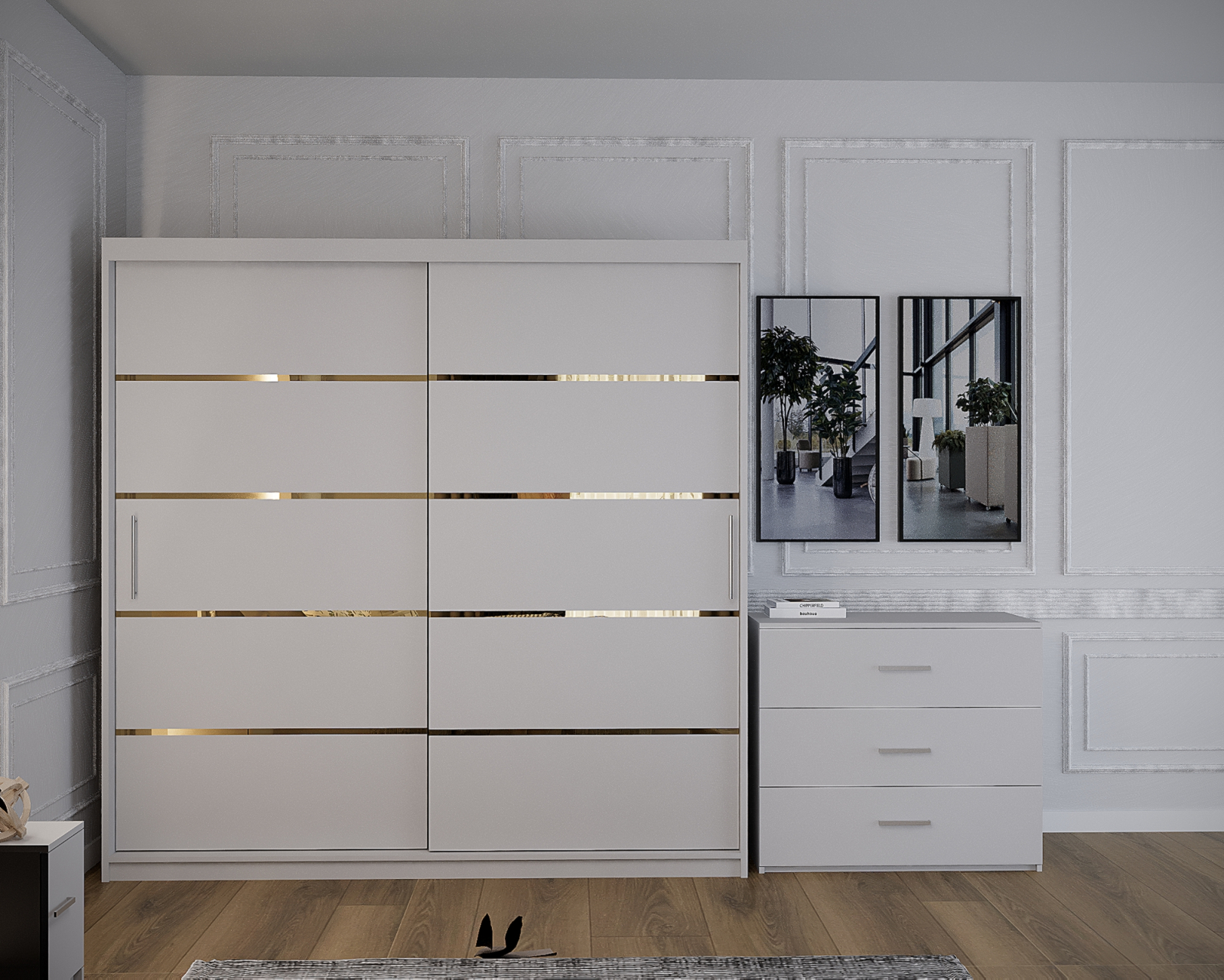 Dormitor Vista cu Pat Tapitat Alb cu dulap 200*200 usi glisante Alb, noptiere si comoda