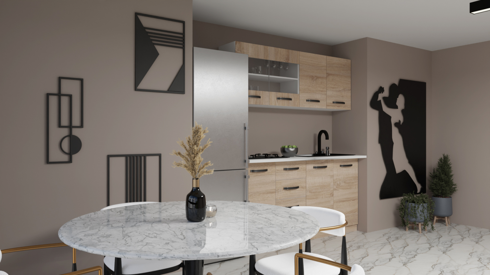 Daca spatiul tau se rezuma la 180cm si esti un iubitor al culorii Sonoma, noi iti recomandam mobila de bucatarie Karina!