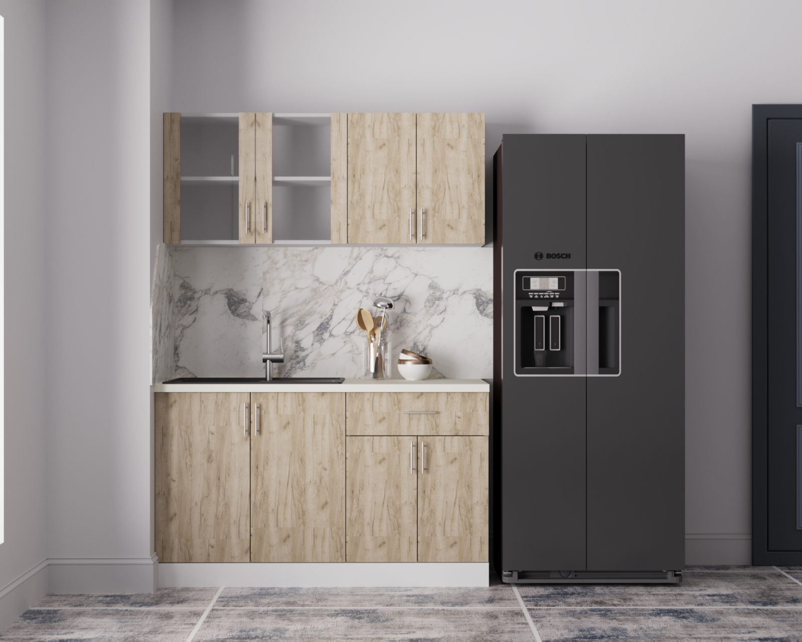 Detalii Materiale: Corp : Pal melaminat Alb Front : Pal melaminat Sonoma Blat : Intreg, termorezistent Glisiere : pe bile Balama: 3 D cu amortizare Manere : metalice Picioare : plastic, reglabile Dimensiunea corpurilor: Inferioare: Masca Chiuveta ( x 1buc ) : 80 x 45 x 85cm Inferior 60 cu 2 usi si sertar ( x 1 buc ) : 60 x 45 x 85 cm Superior: Superior 80 cu 2 usi cu sticla ( x 1 buc) Superior 60 cu 2 usi ( x 1 buc) Dimensiune blat: Intreg 140x60 1 buc (blat termorezistent - 2.8 cm grosime)